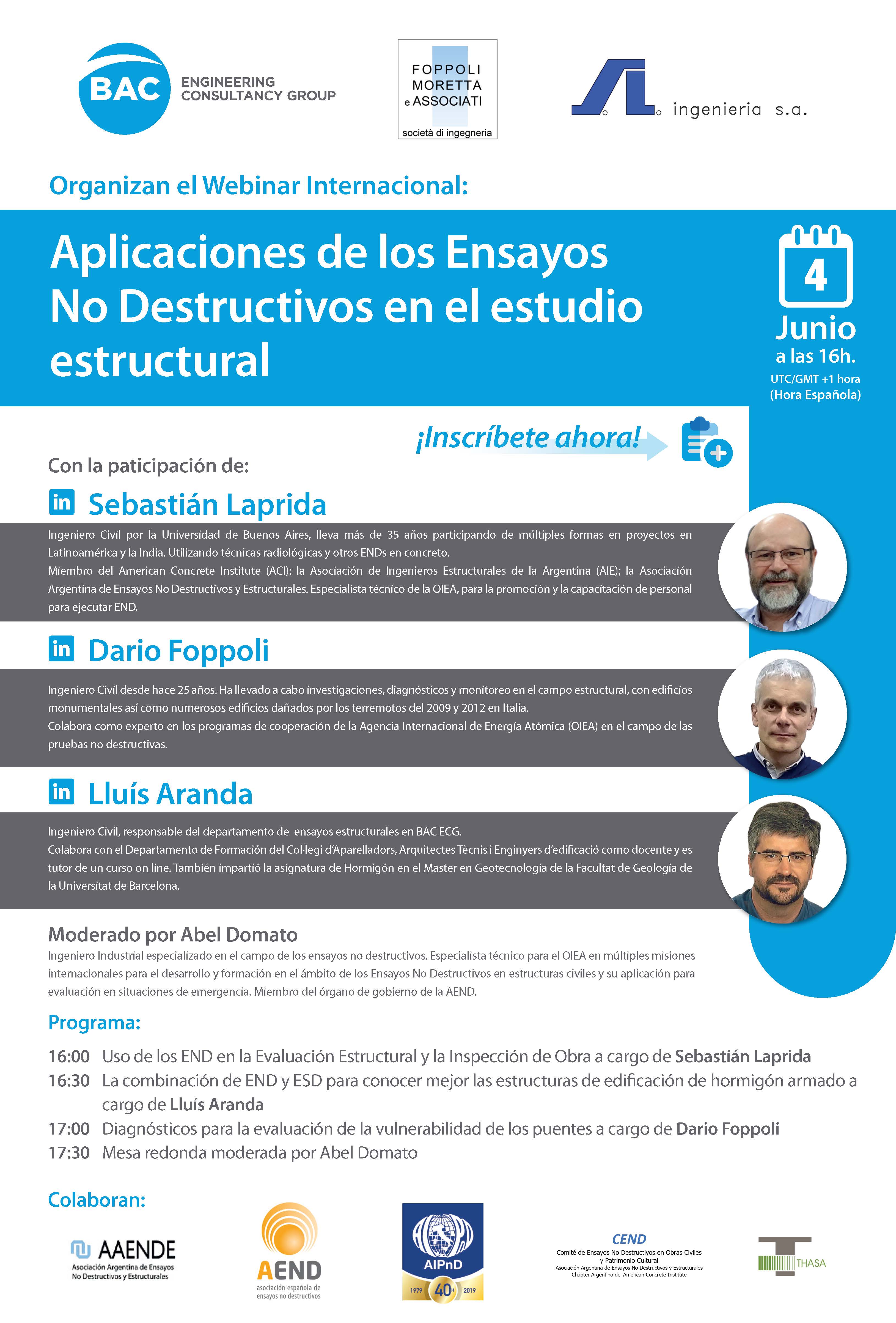 Desde la Asociación de Ensayos No Destructivos nos han invitado a asistir en el Seminario Internacional "Aplicaciones de los Ensayos No Destructivos en el Estudio Estructural", que será una actividad online que se celebrará el próximo día 4 de junio a las 16:00 h. Los participantes presentarán aplicaciones visualmente impactantes, en puentes de más de 300 años, y también cómo se pueden realizar gammagrafías en pilares y vigas, así como la realización de ensayos en estructuras de hormigón armado en edificación, combinando END y ESD.